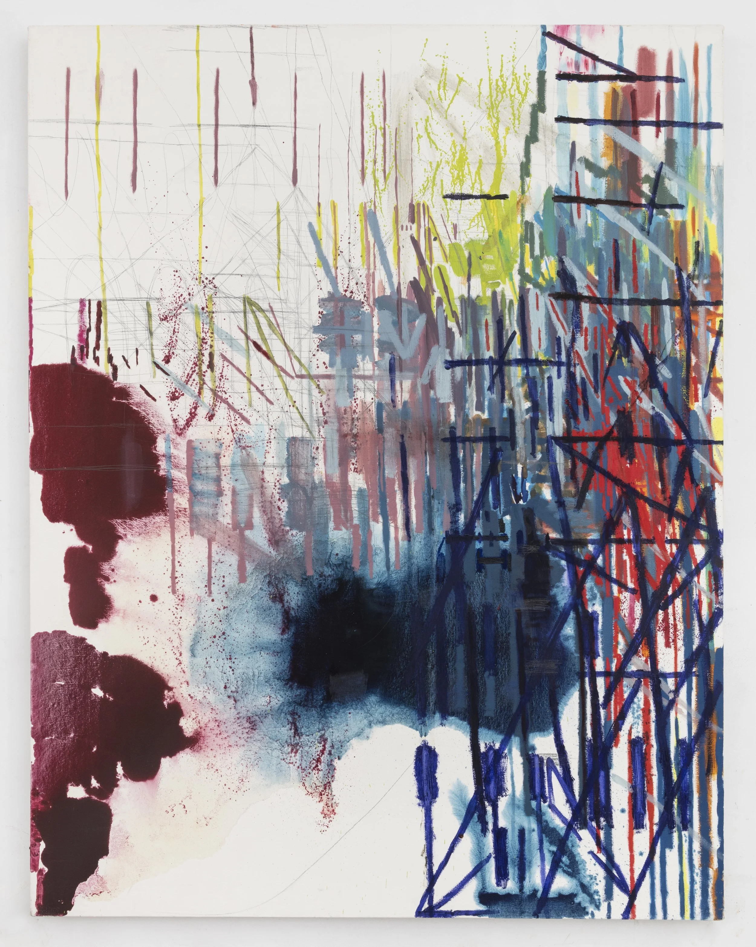“I alternate open, diaphanous areas with pigment pools and incisive marks in my narrative abstract paintings. Varying scales, layers, angles and directions of lines traversing supports reflect this interchange. Soft and hard edges come to blend, align or separate. Diagram-like inflections serve to establish sections that are taut. Rifts form. Collapsed structures build. Formal elements reside either inside supports or run off edges. A dual focus of what is within pieces and outside them emerges. Physicality of supports will either be affirmed or denied. Tensions between infinity and immediacy form,” she writes.